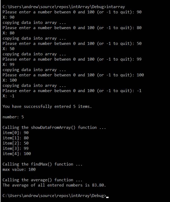 functions that process the array intArray created in the sample program, including showDataFromArray( ), findMax( ), and average( ).