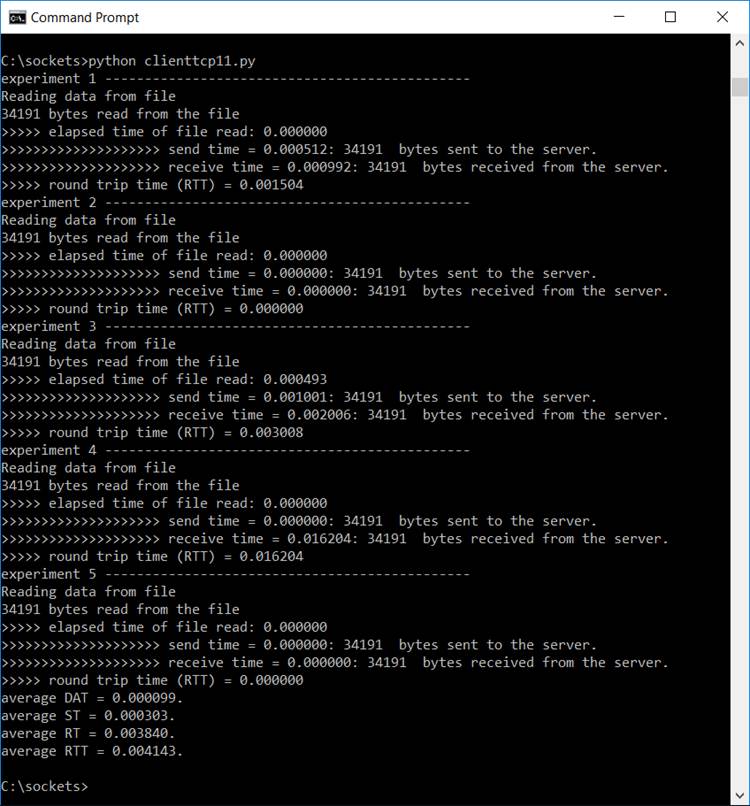 round trip time (RTT) = 0.005013 average DAT = 0.000625. average ST = 0.001880. average RT = 0.000998. average RTT = 0.003634. C:\sockets> |
