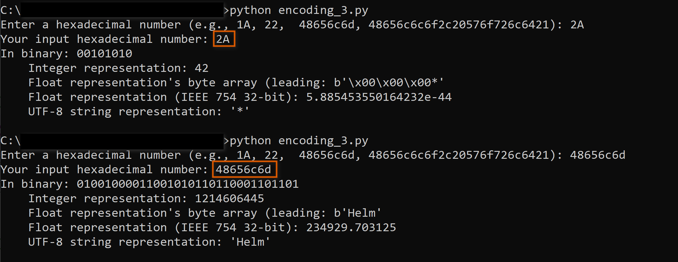 encoding_3.py: input a hexadecimal number and show how it may be interpreted as integer, float and UTF-8 strings. Please download and play with it. You do not need to fully understand the program at this time.