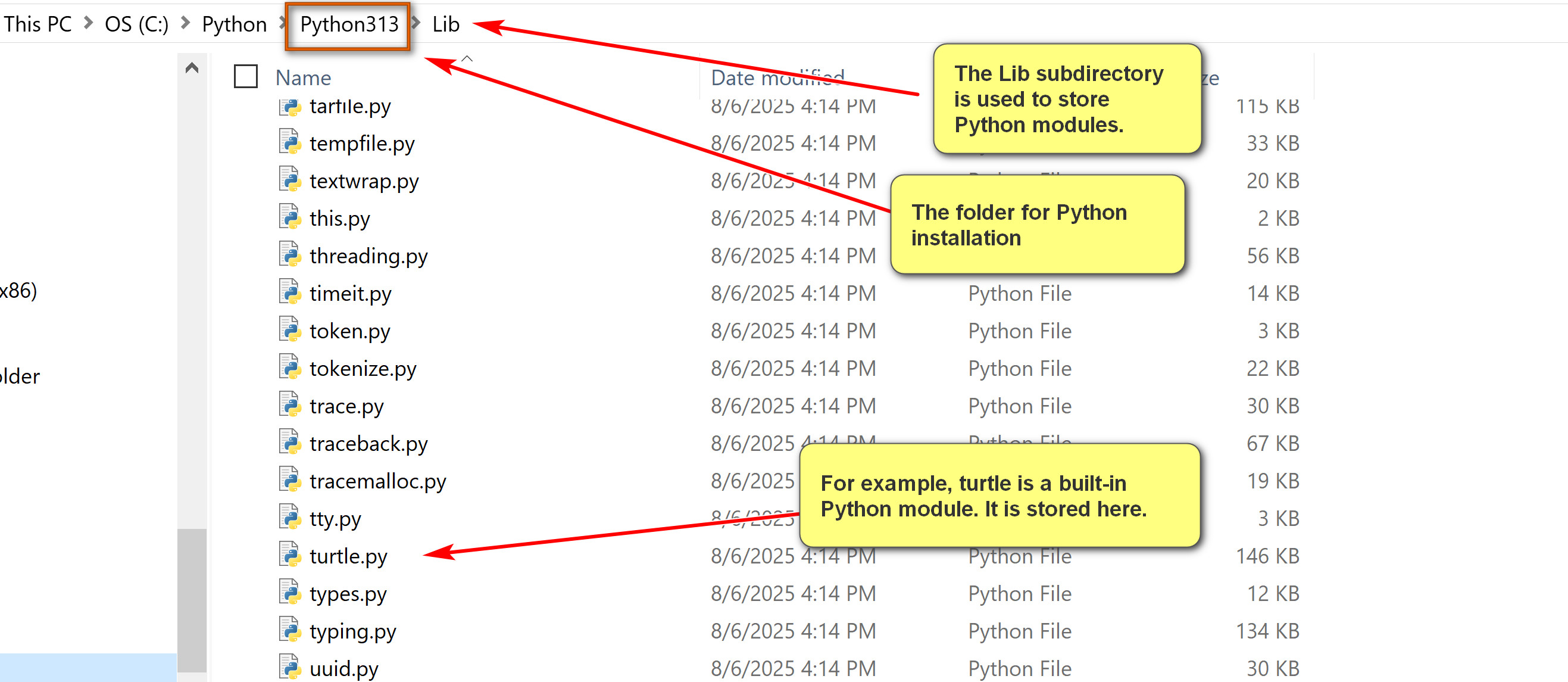 - To manage and access Python modules effectively, they are stored in specific folders (usually the Lib sub-directory of the Python installation.