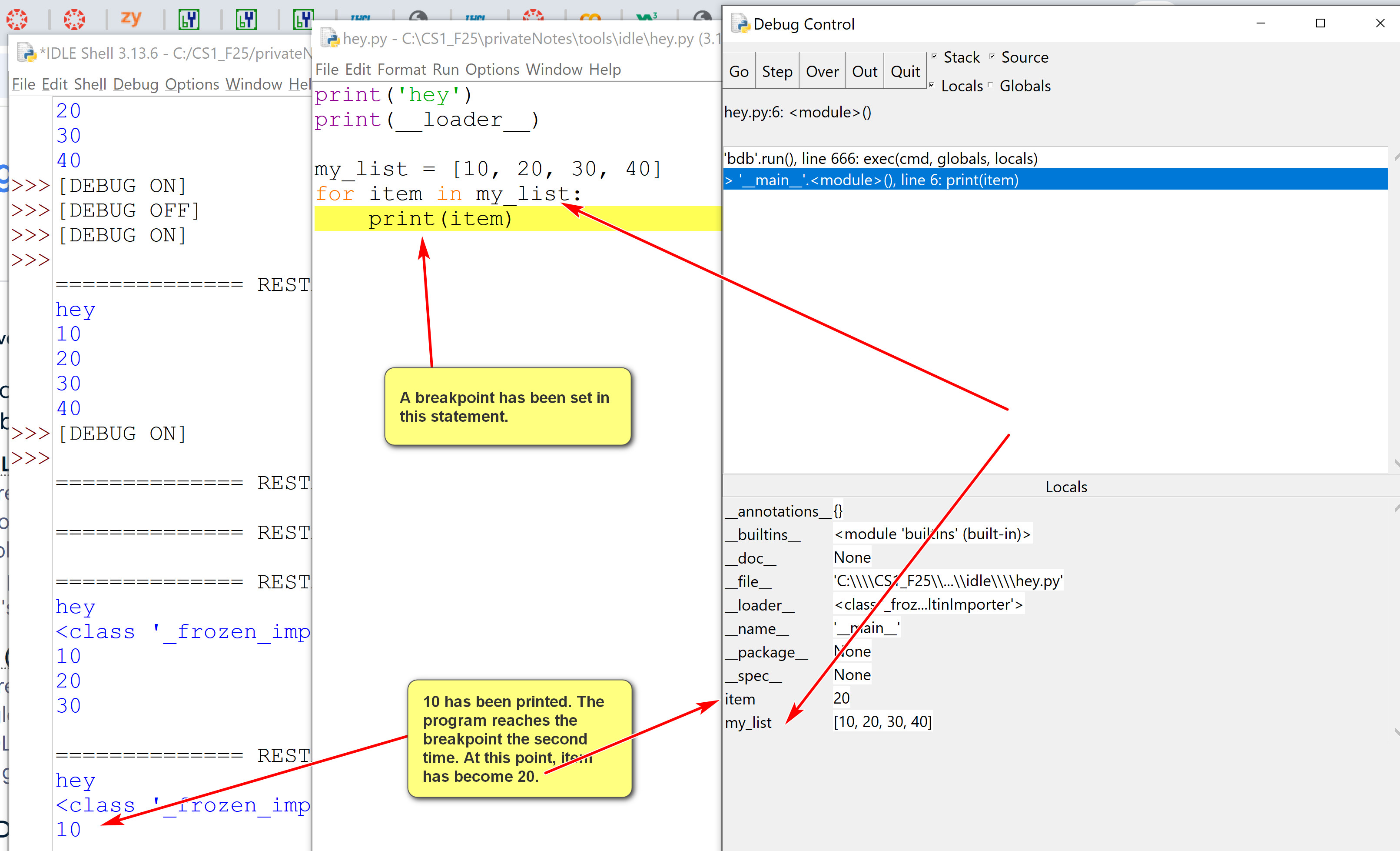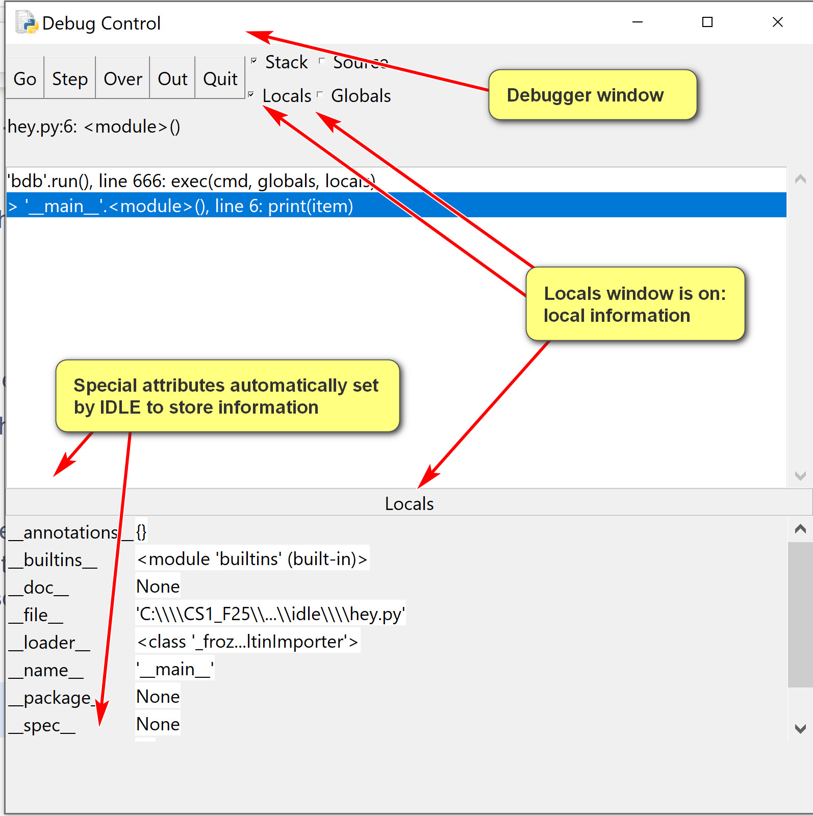 - A good tutorial in IDLE: https://www.cs.uky.edu/~keen/help/debug-tutorial/debug.html. Contain more than needed in the class.