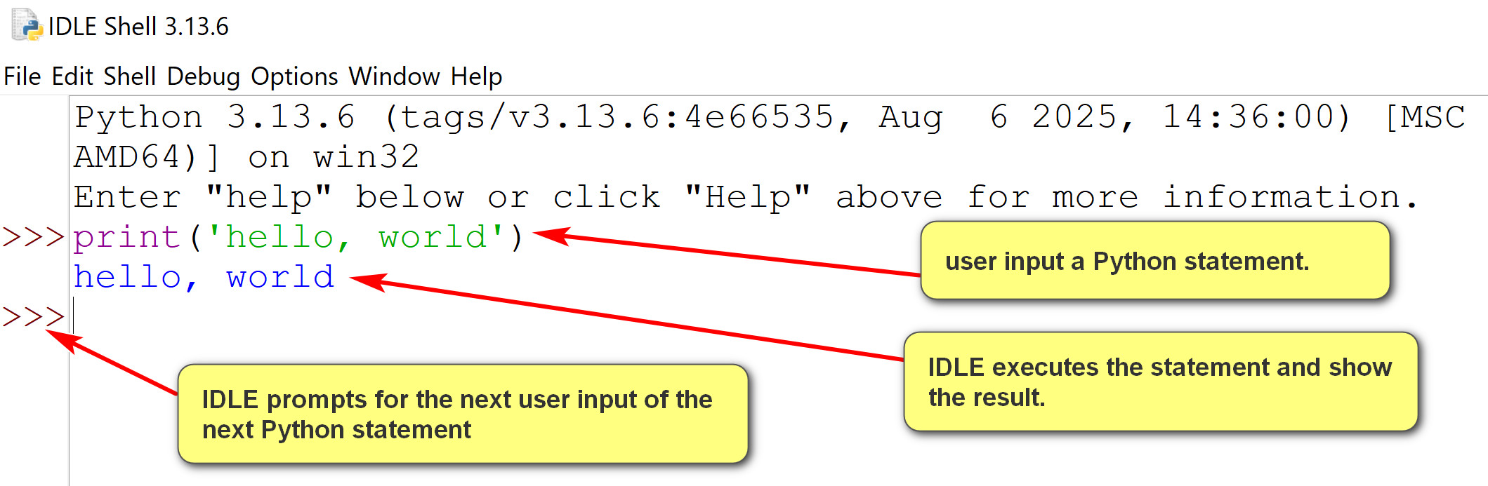 - IDLE shell is an interactive interpreter with REPL (Read-Evaluate-Print loop)