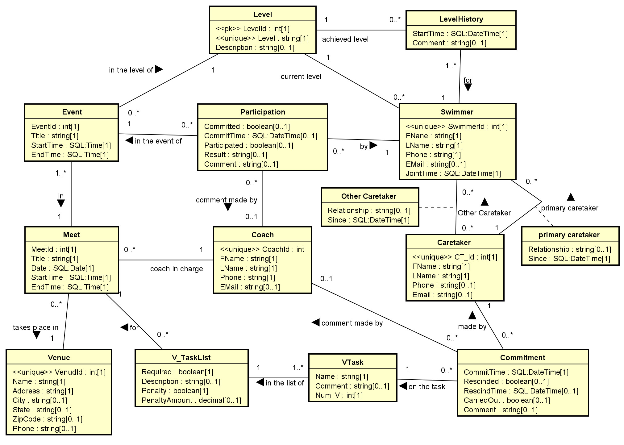 A meet may have many events. Each event has a specific competition level. Swimmer can join an event of his level through a Web application or other means. The time the swimmer commits on participating in an event is needed in various reports. A swimmer may participate in many events in the same meet.